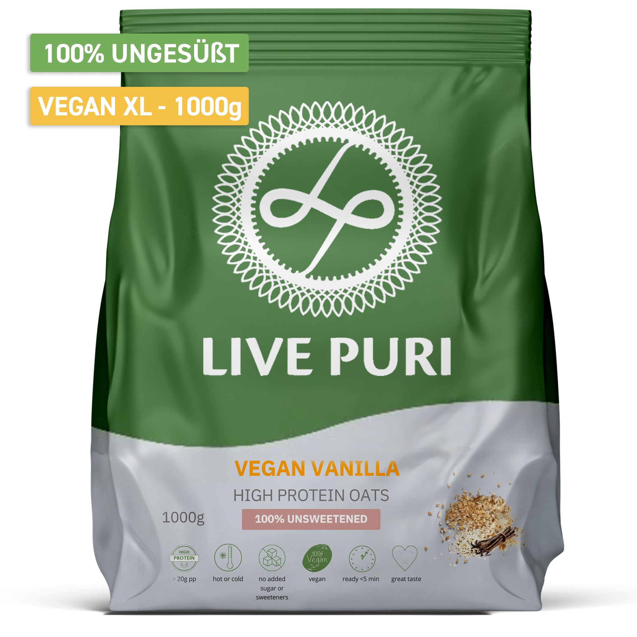 Unsere neuen Vegan High Protein Oats von Live Puri sind dein neues Lieblingsfrühstück! Ein pures und ehrliches Produkt auf Basis unseres ungesüßten Premium-Erbsenprotein-Isolats. Füge feine Haferflocken, Samen und Kerne sowie echte Bourbon Vanille aus Madagaskar hinzu und du erhältst ein 100% natürliches ungesüßtes Frühstück. Und das für 1,30 Euro pro Frühstück!