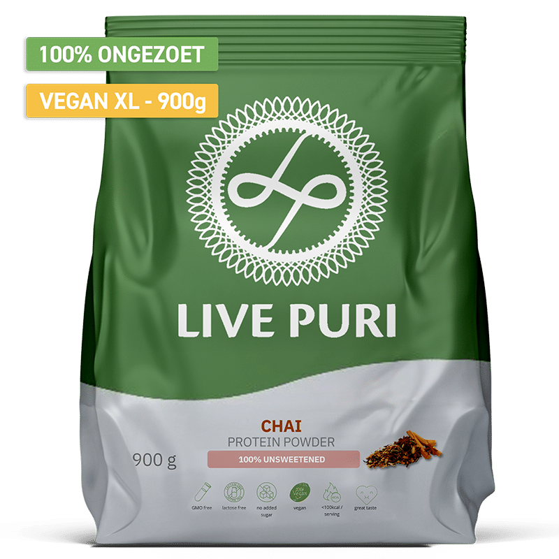 Tipp für mehr Abwechslung: Einen Messlöffel veganes Chai-Proteinpulver von Live Puri zu deinem Smoothie oder dem Pfannkuchenteig geben, um deine Ernährung mit Protein zu bereichern.