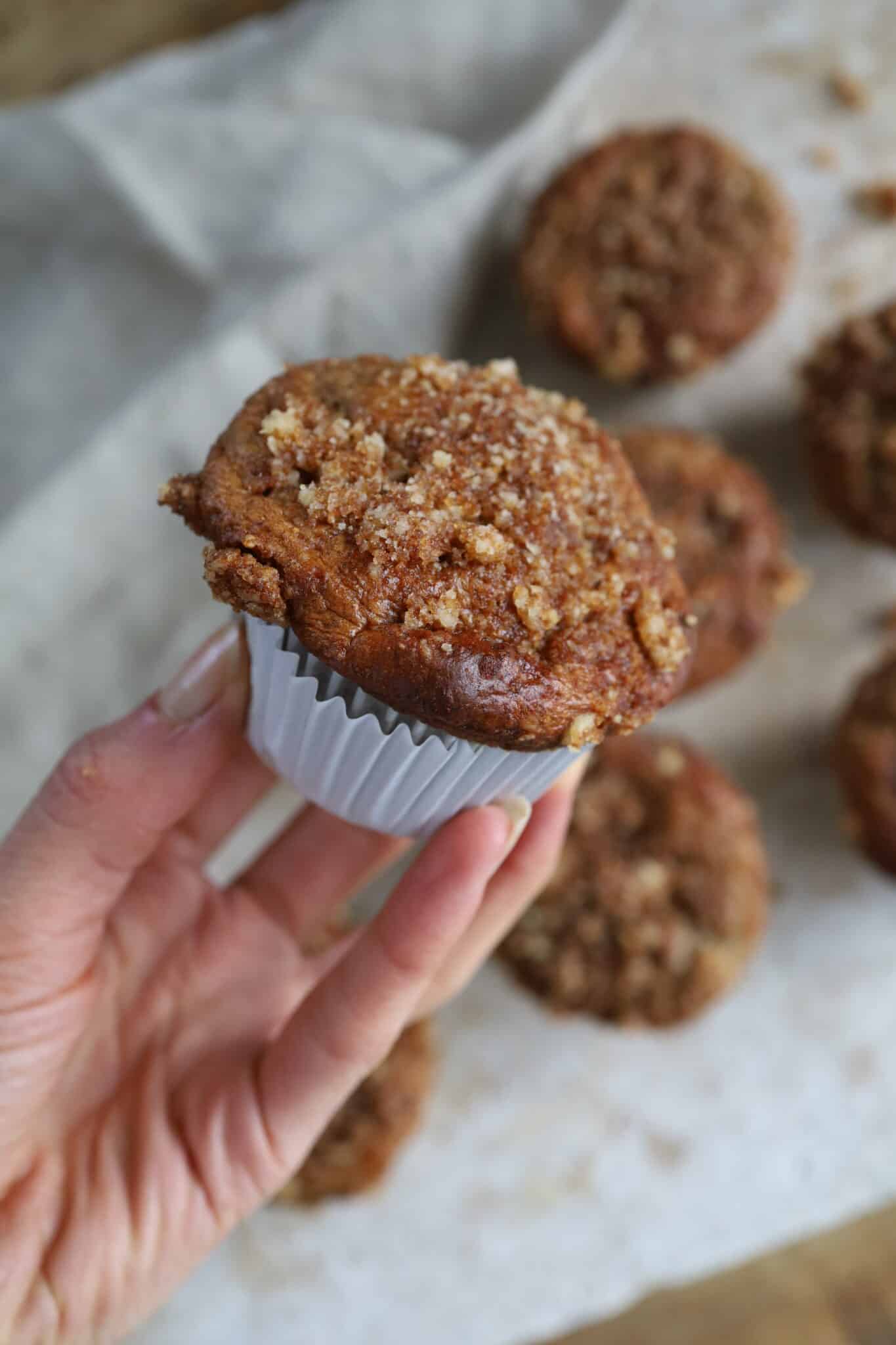 Wer sich schon einmal daran wagt, ein nahrhaftes Gebäck herzustellen, ist sicher aufgefallen, dass überreife Bananen häufig als Ersatz für Butter und Zucker verwendet werden. Bei diesen Bananenmuffins mit Nüssen und Crumble ist das nicht anders. Was jedoch anders ist, ist, dass diese Muffins nicht den typischen ‚gesunden‘ Geschmack haben. Im Gegenteil: Unsere Testperson vermutete, dass wir diese Bananen-Nuss-Muffins mit Crumble in einem Café oder Konditorei gekauft hatten. Das Geheimnis dieser Bananenmuffins mit Nüssen und Crumble? Die Kombination aus überreifen Bananen (je reifer, desto besser), ungesüßtem Apfelmus und einem kleinen bisschen gesundem Fett. Aber natürlich auch unser neutrales Eiweißpulver, das speziell zum Backen entwickelt wurde und teilweise als Ersatz für Mehl verwendet werden kann. Es handelt sich also nicht um staubtrockene, sondern um luftige eiweißreiche Muffins, die die ganze Familie (einschließlich dir selbst) glücklich machen. Auf die Backkünste!