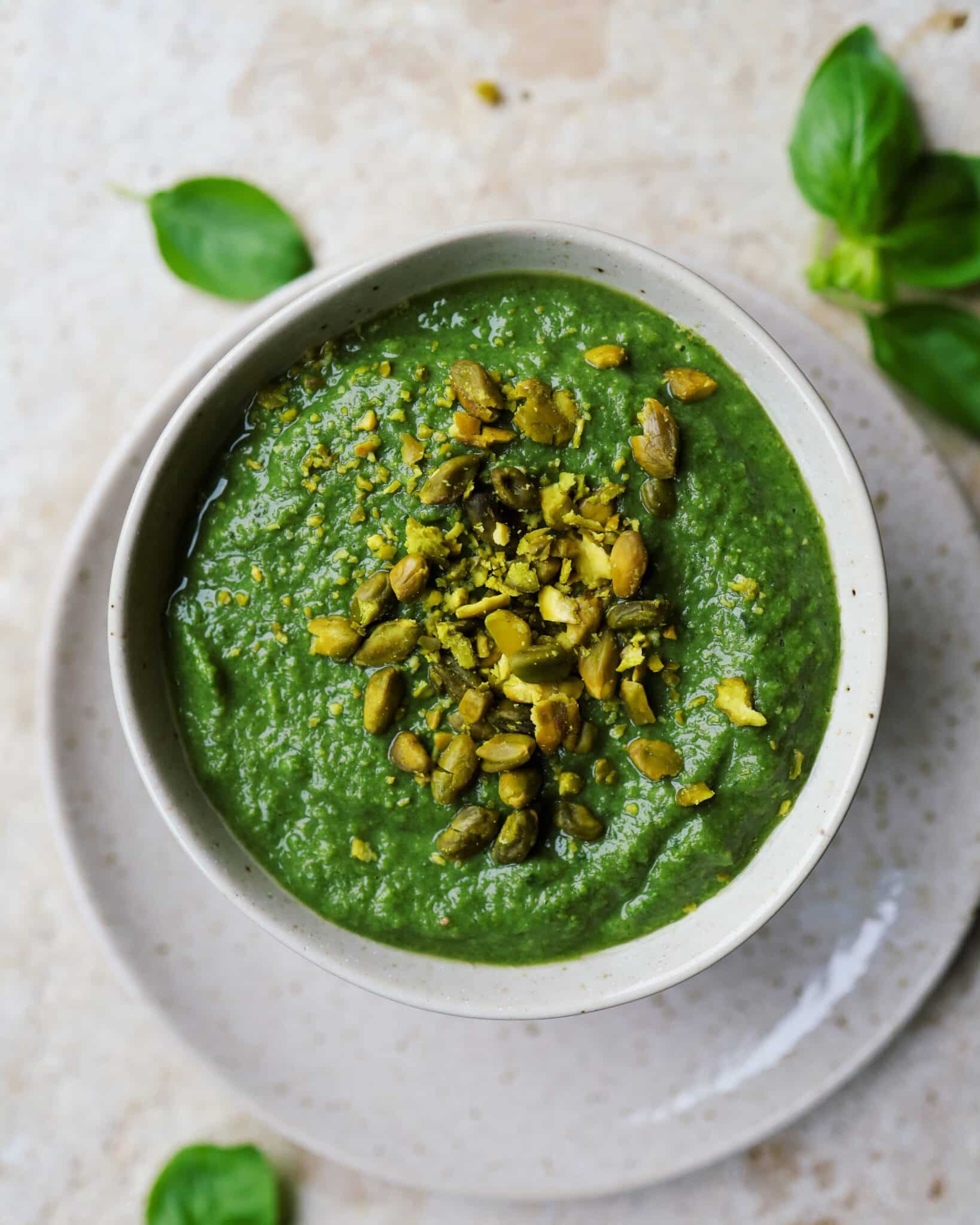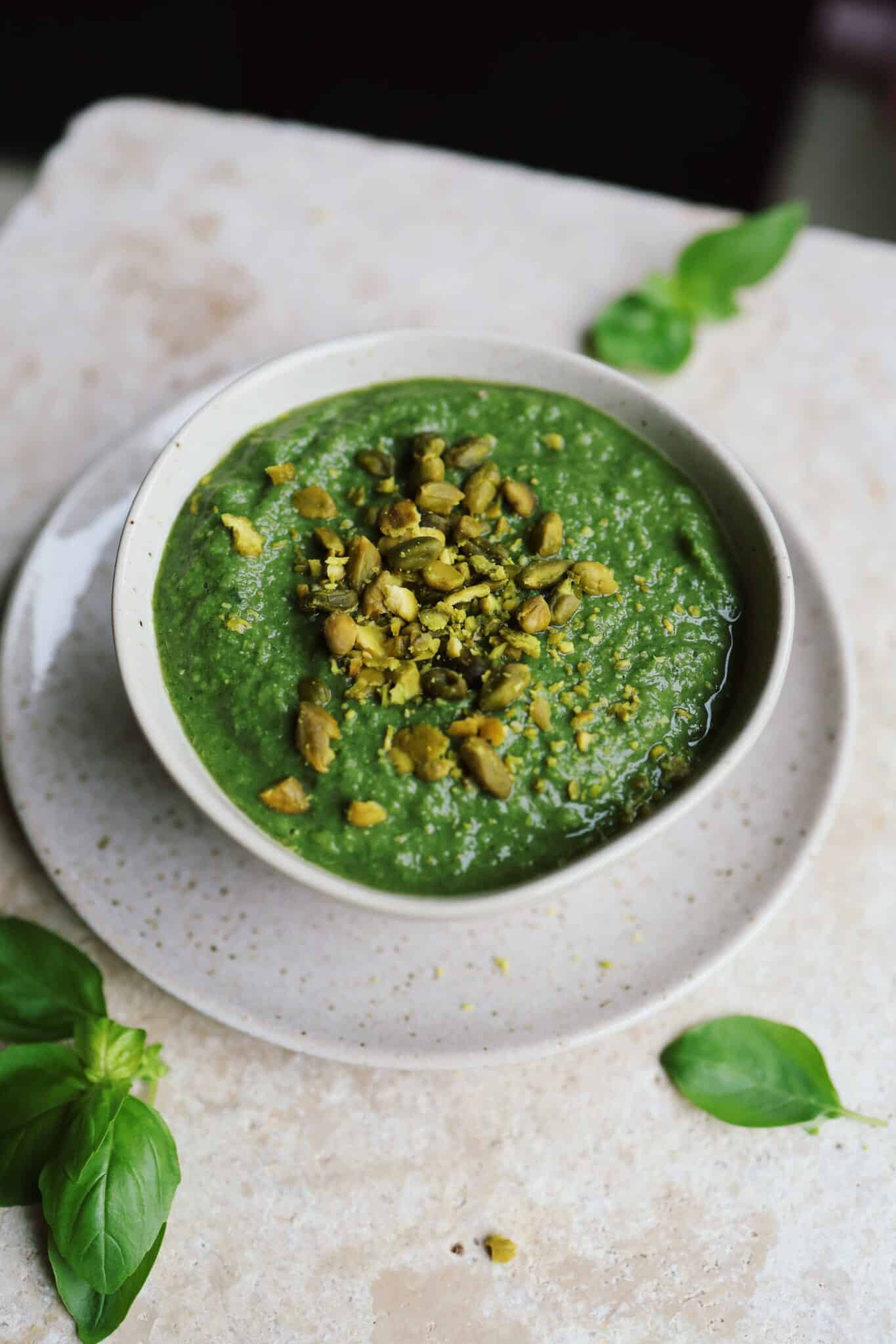 Kennst du das? So Tage, an denen dein Plan, dein Sportplan und deine guten Routinen alle im Eimer sind? An so einem Tag gibt es eigentlich nur eine Sache, die du essen solltest. Richtig: Suppe. Genauer gesagt diese eiweißreiche Erbsensuppe mit Spinat und Pistazienpesto.