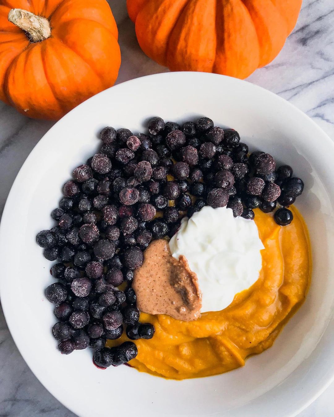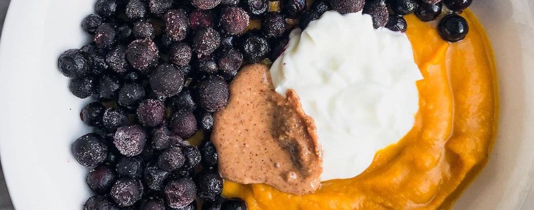 - Dekoriere die Bowl mit gefrorenen Blaubeeren, Kokosjoghurt und Mandelmus.