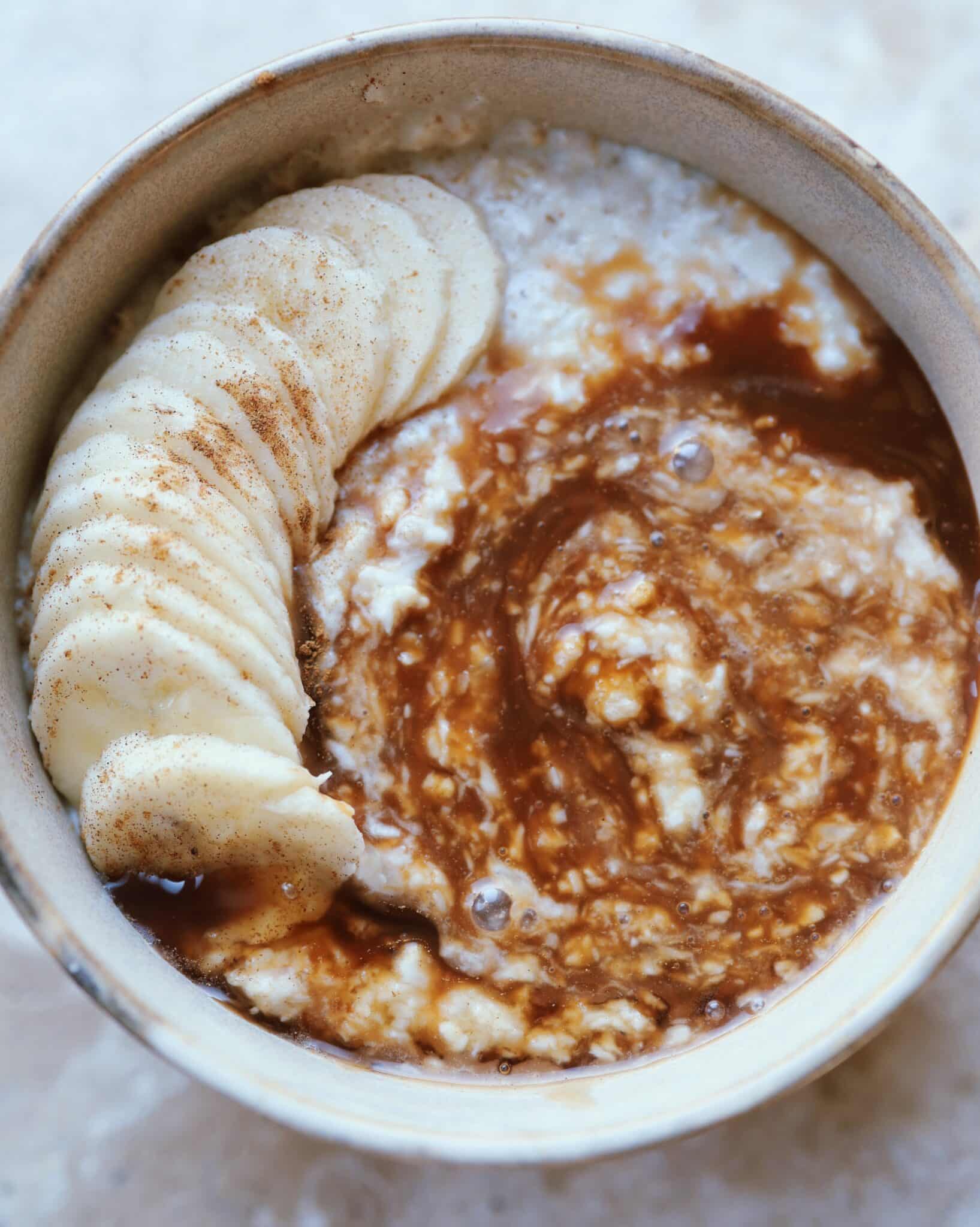 - Rühre die Overnight Oats kurz vor dem Servieren noch einmal um und serviere die Oats mit Caramel Crush und den Bananenscheiben. Ganz einfach – fertig sind deine bezaubernden Overnight Oats!